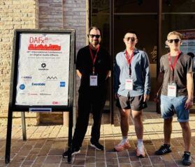 Prof. Sebastian Schlecht, Cristóbal Andrade and Jeremy Bai from the Artificial Audio Group at the LMS attended the International Conference on Digital Audio Effects (DAFx25), which took place in Ancona, Italy from Sept. 2 – 5, 2025. At the conference, Cristóbal and Jeremy presented their papers on their latest research. A particular highlight was that Prof. Sebastian Schlecht, together with Vesa Välimäki, Roope Salmi, Stefan Bilbao, and David Zicarelli, received the Third Best Paper Award for their joint work on “Zero-phase sound via giant FFT“.