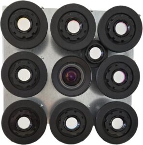 Camera arrays are increasingly used in fields such as industrial quality control, remote sensing, or medical imaging. A particularly innovative system, which is shown in the figure below, is a newly developed array consisting of nine cameras and an additional short-wave infrared (SWIR) unit. Through upstream interchangeable filters, the array enables the detection of wavelengths in the infrared range that are invisible to the human eye. If three arbitrary wavelengths are overlaid as red, green, and blue channels, a so-called false-color image is created, revealing structures that are not perceptible to the human eye. This principle thus opens up a wide range of new applications, for example in identifying plastics, differentiating tissue, or detecting pressure marks on fruits and vegetables. In this way, the high sensor density and extended spectral sensitivity provide a basis for more precise and efficient analyses.